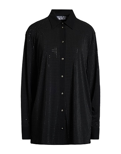 long shirt, crepe, solid color with appliqués, crystals, classic collar, long sleeves, buttoned cuffs, button fastenings, hand wash, do not bleach, do not tumble dry, do not iron, this brand runs small