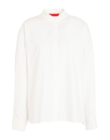 shirt, poplin, solid color, pleated, mandarin collar, long sleeves, buttoned cuffs, button fastenings, side slit hemline, machine wash or dry clean, do not bleach, do not tumble dry