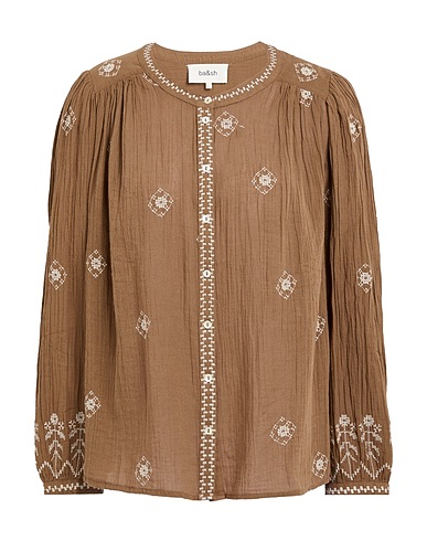 shirt, woven, solid color with appliqués, embroidered, gathered, crewneck, long sleeves, button fastenings, hand wash or dry clean, do not bleach, do not tumble dry