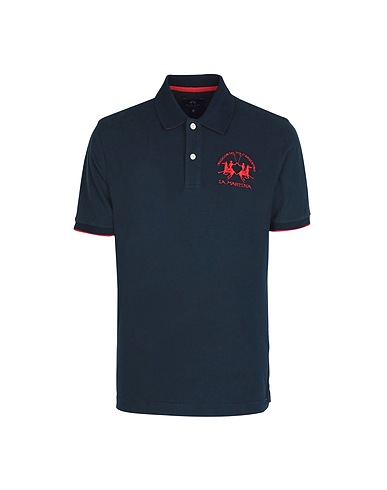 piqué, embroidered, brand logo, solid color with appliqués, polo collar, short sleeves, button fastenings, without pockets, side slit hemline, stretch, machine wash, do not bleach, do not tumble dry