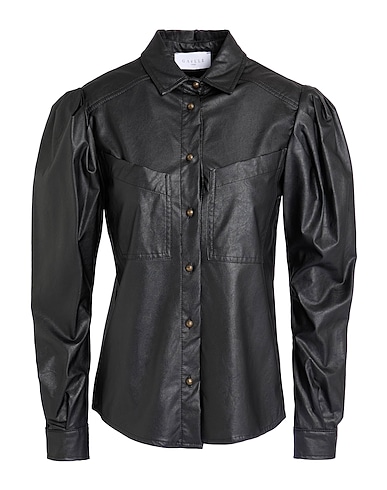 shirt, synthetic material, solid color, no appliqués, classic collar, long sleeves, puffed sleeves, buttoned cuffs, button fastenings, two chest pockets