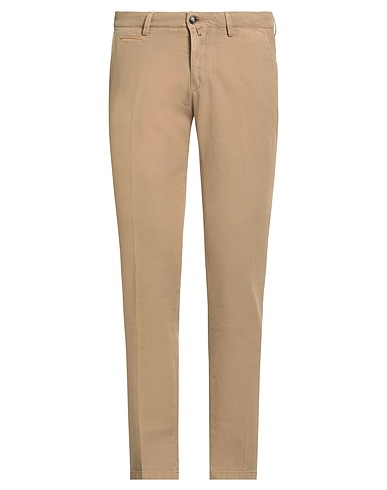 chino pants, gabardine, solid color, leather trims, brand logo, mid rise, tapered leg, slim fit, multipockets, contains non-textile parts of animal origin, this brand runs small