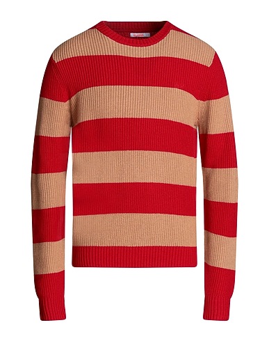knitted, medium-weight knit, brand logo, stripes, crew neck, long sleeves, no pockets
