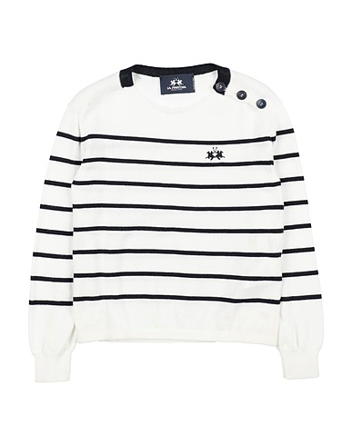 knitted, lightweight knit, embroidered logo, striped, crewneck, long sleeves, button fastenings, without pockets, machine wash or dry clean, do not bleach, do not tumble dry