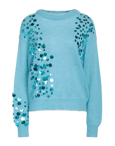 knitted, lightweight knit, sequins, solid color with appliqués, crewneck, long sleeves, hand wash, do not bleach, do not tumble dry