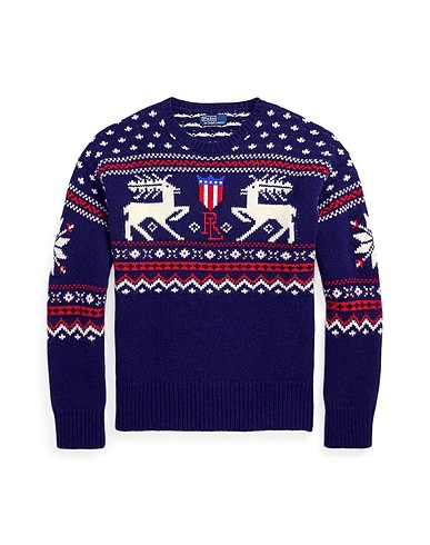 wool, mid-weight knit, brand logo, multicolor, crewneck, long sleeves, this item contains wool sourced from farms where animal welfare is valued, hand wash or dry clean, tumble dry, this brand runs large