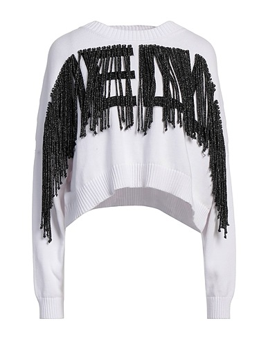 knitted, metallic, lightweight knit, solid color with appliqués, embroidered logo, fringes, crewneck, long sleeves, machine wash or dry clean, do not bleach, do not tumble dry