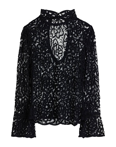 crochet-knit, lightweight knit, brand logo, solid color, mock neck, long sleeves, button fastenings, hand wash or dry clean, do not bleach, do not tumble dry