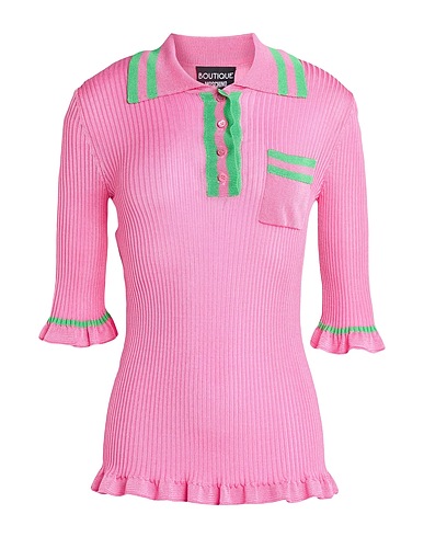 knitted, lightweight knit, two-tone, side seam stripes, polo collar, 3/4 length sleeves, button fastenings, dry clean, do not bleach, do not tumble dry, do not iron