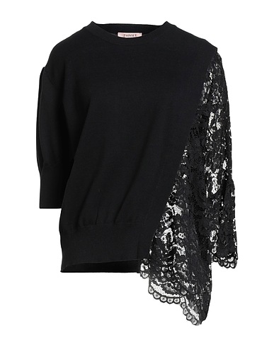 knitted, lace, lightweight knit, brand logo, solid color, crewneck, 3/4 length sleeves, hand wash or dry clean, do not bleach, do not tumble dry