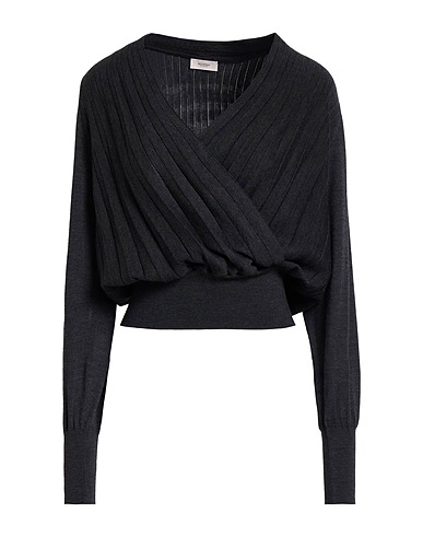ribbed-knit, lightweight knit, wrap-effect, pleated, brand logo, mélange, v-neck, long sleeves, dry clean, do not bleach, do not tumble dry