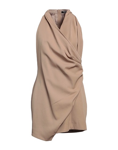cool wool, draped, solid color, v-neck, sleeveless, fully lined, zipper fastening, no pockets, dry clean, do not tumble dry, do not bleach, bodycon dress