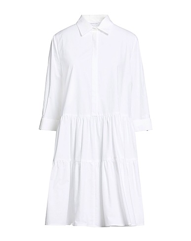 shirt dress, poplin, solid color, tiered, classic collar, 3/4 length sleeves, unlined, concealed button fastenings, machine wash or dry clean, do not bleach, do not tumble dry