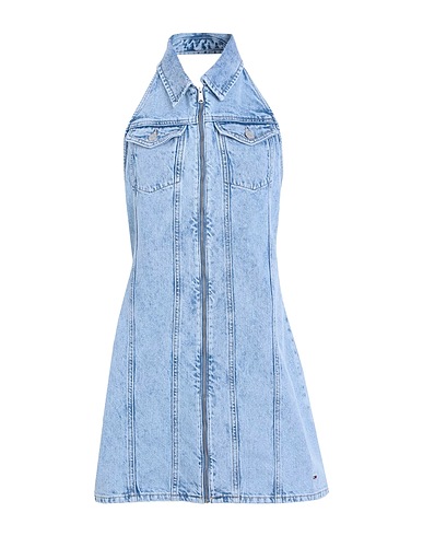 denim, open back, brand logo, solid color, classic collar, light wash, sleeveless, unlined, zipper fastening, two breast pockets, dress