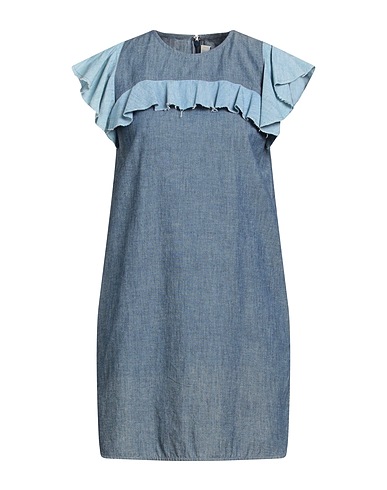 woven, denim effect, tiered, two-tone, crewneck, short sleeves, unlined, zipper fastening, hook fastenings, multipockets, side slit hemline, flared dress