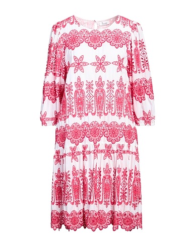broderie anglaise, gathered, two-tone, crewneck, 3/4 length sleeves, fully lined, 1 button, no pockets, machine wash or dry clean, do not tumble dry, do not bleach, flared dress