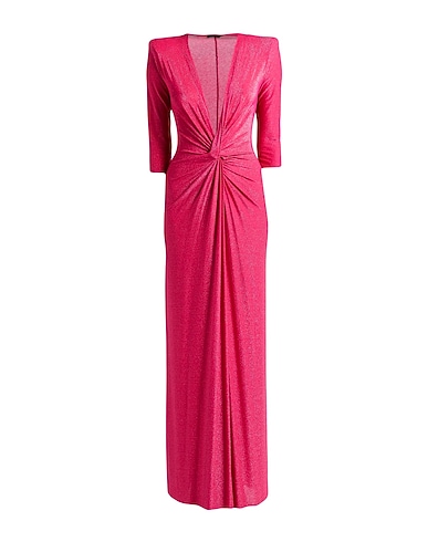 gown, knitted, lightweight knit, metallic, stretchy fabric, solid color, no appliqués, deep neckline, 3/4 length sleeves, unlined, without pockets, dry clean, do not bleach, do not tumble dry, be the best-dressed bridesmaid or wedding guest with this designer piece, perfect for any ceremony
