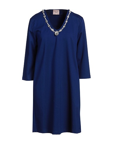 flared dress, jersey, stretchy fabric, solid color with appliqués, crystals, v-neck, 3/4 length sleeves, unlined, without pockets, hand wash or dry clean, do not bleach, do not tumble dry