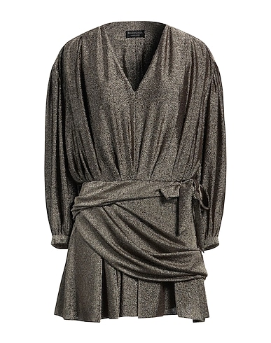 dress, lamé, metallic, stretchy fabric, solid color, draped, v-neck, long sleeves, unlined, zipper fastening, hook fastenings, without pockets, dry clean, do not bleach, do not tumble dry, amp up the glamour with chic designer party outfits for your next event or fun night out