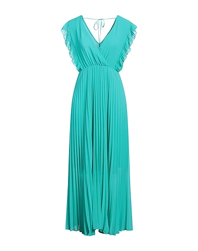 pleated dress, crepe, solid color, no appliqués, deep neckline, sleeveless, fully lined, dry clean, do not bleach, do not tumble dry