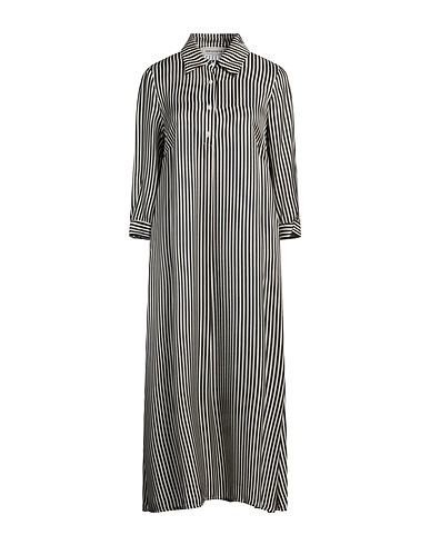 shirt dress, crepe, striped, brand logo, classic collar, 3/4 length sleeves, unlined, button fastenings, multipockets, dry clean, do not bleach, do not tumble dry
