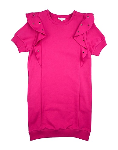 french terry, woven, solid color with print, embellished, ruffles, knitted trims, crewneck, short sleeves, machine wash, do not bleach, do not tumble dry, this brand runs large