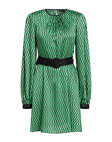 flared dress, twill, geometric-print, belt, crewneck, long sleeves, shoulder pads, unlined, zipper fastening, 1 button, machine wash or dry clean, do not bleach, do not tumble dry
