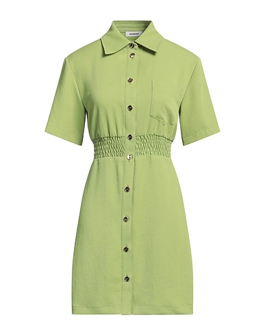 shirt dress, woven, solid color, shirred, classic collar, short sleeves, unlined, button fastenings, one chest pocket, machine wash or dry clean, do not bleach, do not tumble dry