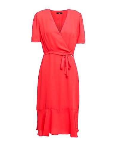 flared dress, crepe, solid color, brand logo, v-neck, short sleeves, fully lined, zipper fastening, tie fastening, without pockets, machine wash, tumble dry