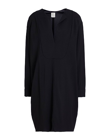 flared dress, crepe, solid color, no appliqués, camp collar, long sleeves, buttoned cuffs, unlined, stretch, dry clean, do not bleach, do not tumble dry