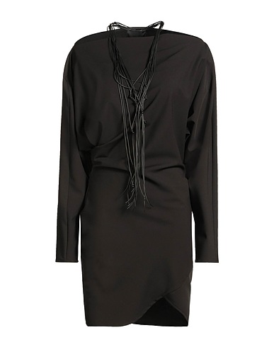 dress, crepe, stretchy fabric, solid color with appliqués, detachable application, brand logo, gathered, boat neckline, long sleeves, unlined, machine wash or dry clean, do not bleach, do not tumble dry