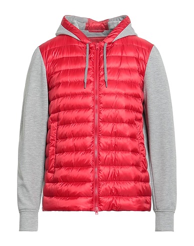 down jacket, shell, jersey, quilted, no appliqués, two-tone, hooded, long sleeves, goose down interior, lightweight padding, zipper fastening, slit pockets, internal pockets, drawstring hem, contains non-textile parts of animal origin, hand wash, do not bleach, do not tumble dry