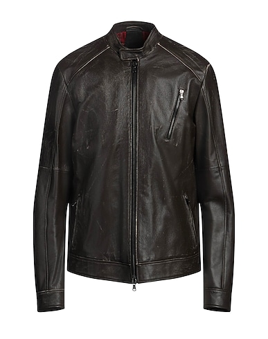 biker jacket, leather, solid color, no appliqués, crewneck, long sleeves, zipped cuffs, fully lined, zipper fastening, zipped pockets, contains non-textile parts of animal origin, do not dry clean, do not bleach, do not tumble dry, do not iron