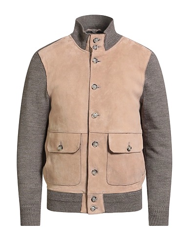 casual jacket, suede, knitted trims, two-tone, crewneck, long sleeves, synthetic filling, lightweight padding, button fastenings, patch pockets, contains non-textile parts of animal origin, specialist clean or dry clean, do not bleach, do not tumble dry