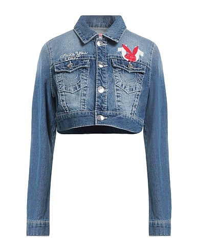 denim trucker jacket, denim, faded, solid color with appliqués, embroidered logo, cropped, medium wash, classic collar, long sleeves, buttoned cuffs, fully lined, button fastenings, two chest pockets, hand wash, do not bleach, do not tumble dry