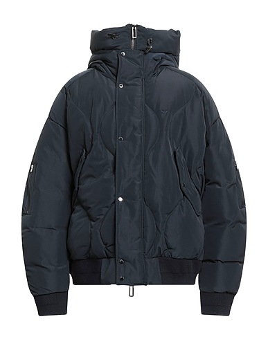 down jacket, shell, embroidered logo, brand logo, knitted trims, solid color, hooded, long sleeves, ribbed cuffs, duck down filling, heavyweight padding, zipper fastening, snap fastenings, bellows pockets, zipper pocket, contains non-textile parts of animal origin, machine wash, do not bleach, do not tumble dry
