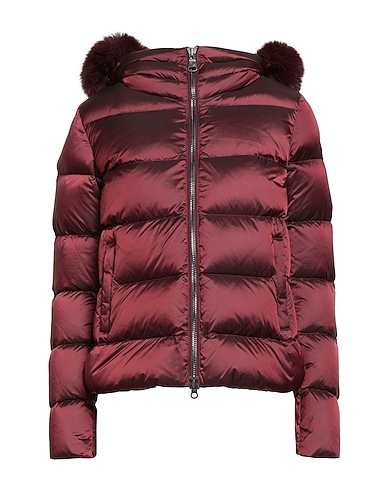 down jacket, shell, plush fabric, quilted, brand logo, solid color, detachable hood, long sleeves, duck down filling, lightweight padding, zipper fastening, zipped pockets, contains non-textile parts of animal origin, machine wash, do not bleach, tumble dry, do not iron