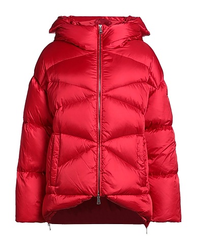 down jacket, shell, brand logo, solid color with print, hooded, long sleeves, duck down filling, heavyweight padding, zipper fastening, slit pockets, contains non-textile parts of animal origin, machine wash or dry clean, do not bleach, do not tumble dry