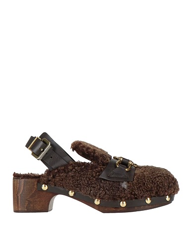 clogs, teddy fleece, solid color with appliqués, metal applications, buckle, round toe, block heel, rubber cleated sole, lined in shearling, contains non-textile parts of animal origin, small sized