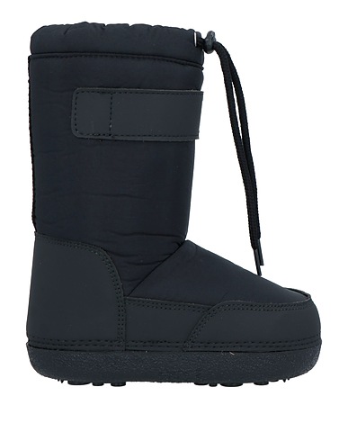 padded boots, shell, synthetic material, solid color, brand logo, plush fabric inner, round toe, flat, rubber cleated sole