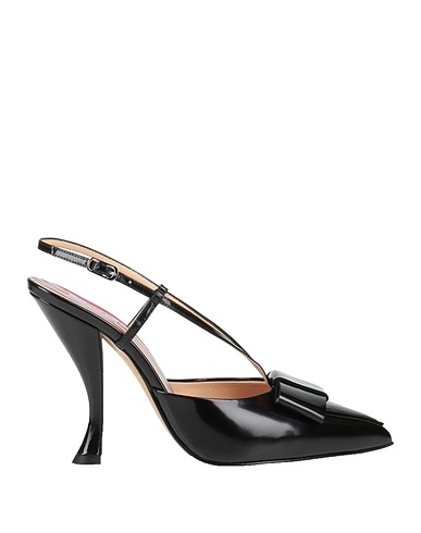 leather, varnished effect, bow-detailed, solid color, leather backing, buckle fastening, narrow toeline, spool heel, leather sole, contains non-textile parts of animal origin, slingback pumps