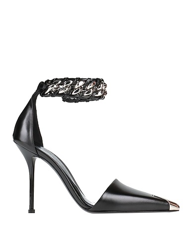 pumps, leather, solid color with appliqués, metal applications, leather lining, buckle-fastening ankle strap, pointed toe, spike heel, leather sole, contains non-textile parts of animal origin
