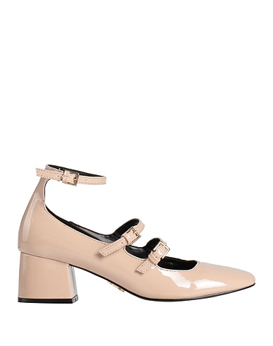 coated fabric, patent-effect, no appliqués, solid color, fully lined, buckle fastening, buckle-fastening ankle strap, round toe, square heel, rubber sole, mary jane pumps