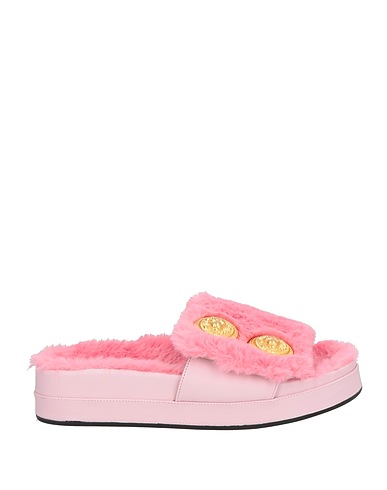 plush fabric, leather, metal applications, solid color with appliqués, leather lining, round toe, flat, rubber sole, contains non-textile parts of animal origin, slide sandals