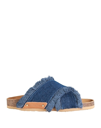 denim, brand logo, fringes, solid color with appliqués, round toe, flat, rubber sole, contains non-textile parts of animal origin, sandals