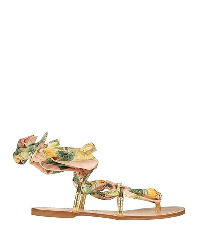 thong sandals, satin, floral-print, no appliqués, leather lining, ties at ankle, round toe, flat, rubber sole, contains non-textile parts of animal origin