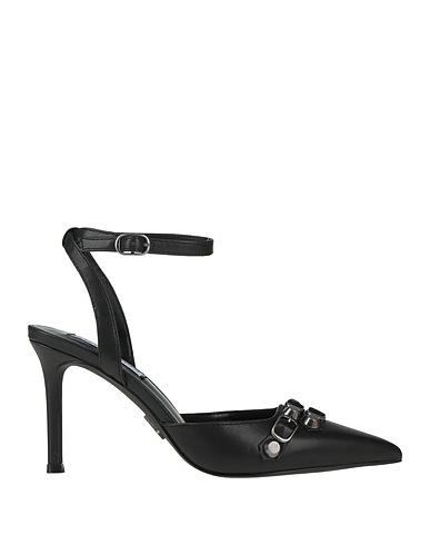 pumps, synthetic material, solid color with appliqués, strap detailing, embellished, lined interior, buckle-fastening ankle strap, pointed toe, spike heel, covered heel, rubber sole