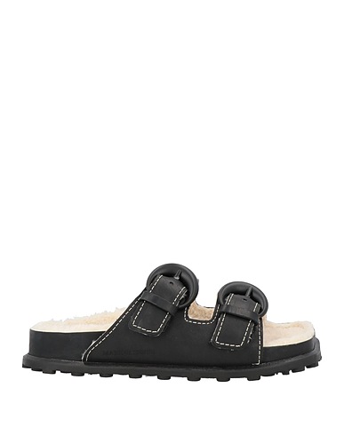 leather, no appliqués, solid color, plush fabric inner, square toe, flat, rubber cleated sole, contains non-textile parts of animal origin, sandals