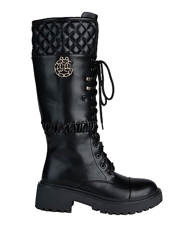 boots, synthetic material, quilted, solid color with appliqués, brand logo, zipper fastening, lace-up, round toe, block heel, fabric inner, lug sole