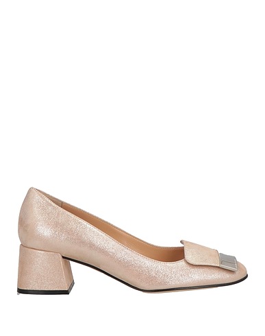 pumps, suede, metallic, solid color with appliqués, embellished, brand logo, leather lining, square toe, square heel, covered heel, leather sole, contains non-textile parts of animal origin